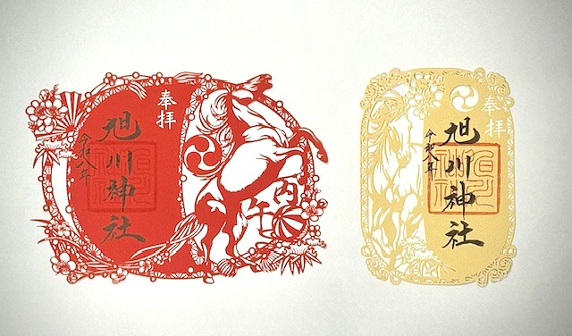 干支切り絵御朱印 初穂料 片面サイズ(右)は800円 見開きサイズ(左)は1200円となります.元旦より頒布開始。年間通しての数を御用意しておりますが、なくなり次第終了となります。御朱印は社務所で承ります。